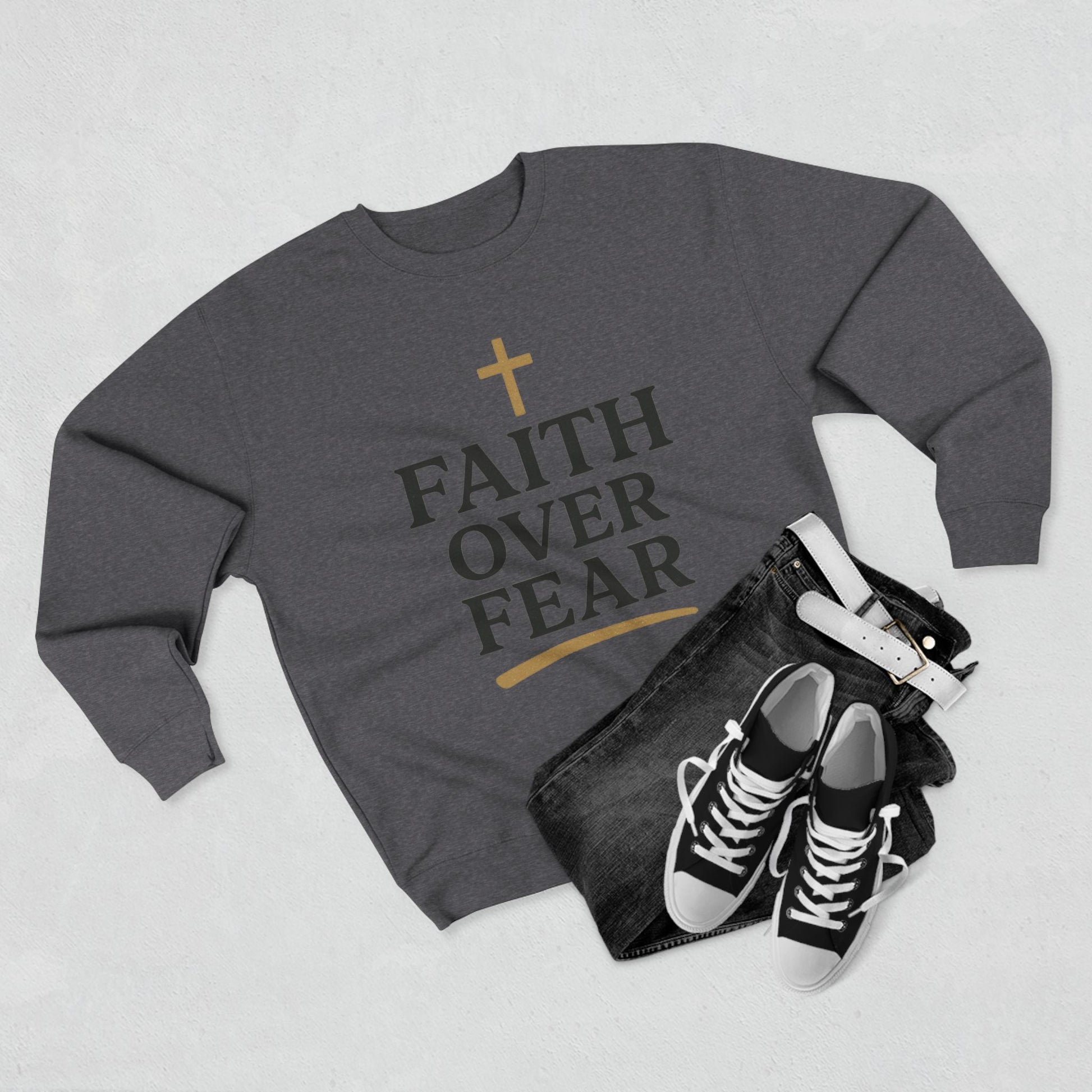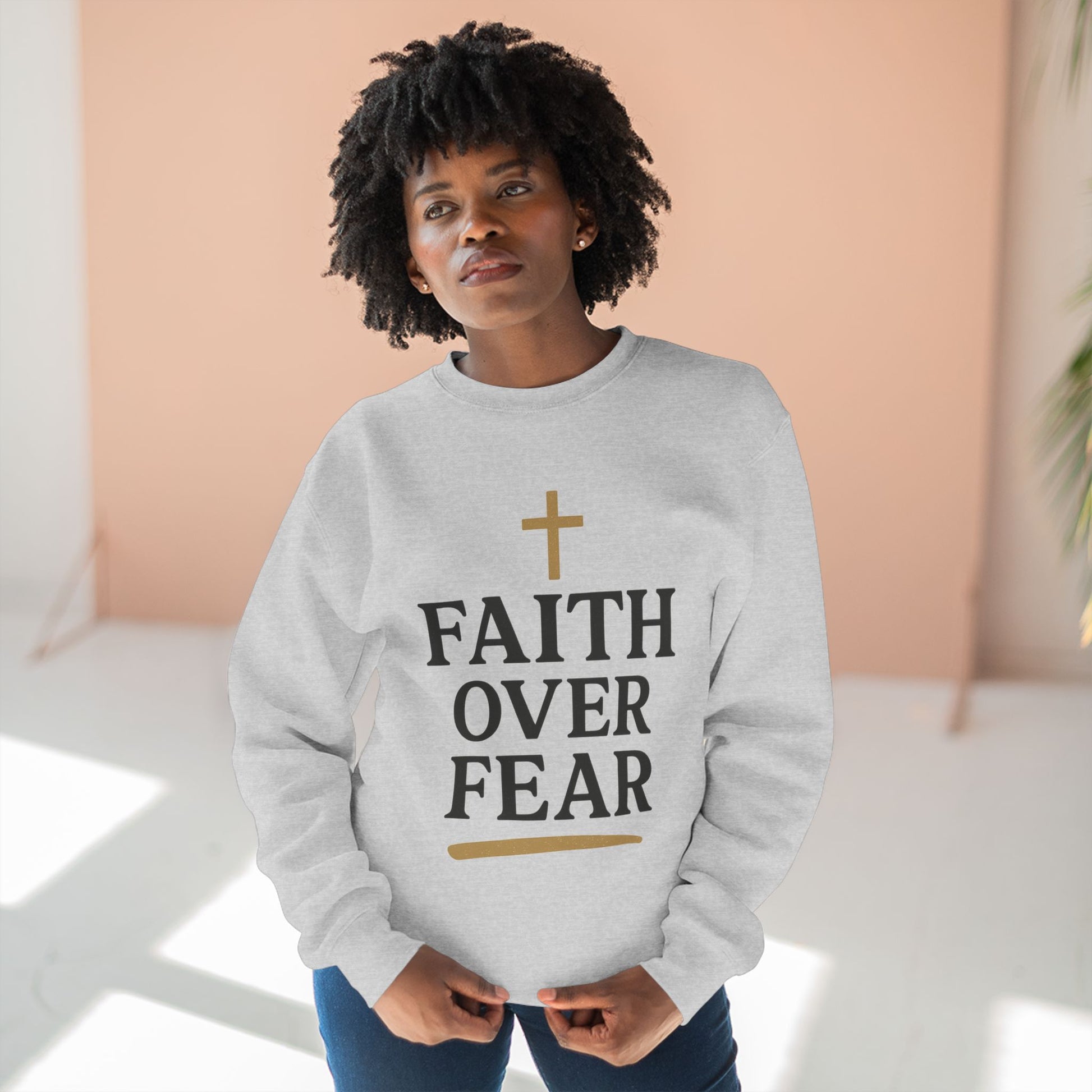 Embrace bold faith with our “Faith Over Fear” Christian sweatshirt and t-shirt. Designed for men and women, this inspiring piece is perfect for everyday wear, church, or casual outings. A powerful reminder to trust God and walk in confidence. Elevate your wardrobe with this stylish Unisex Crewneck Sweatshirt, designed to provide comfort and an uplifting vibe. Its message of 'Faith Over Fear' inspires positivity and resilience, making it a great addition to any casual outfit. Perfect for cozy days spent with loved ones or for a relaxed outing with friends, this sweatshirt fits seamlessly into your lifestyle. Targeted towards individuals looking for both comfort and motivation, it's ideal for those who wish to express their faith or support a positive message. Great for holidays like Christmas, Easter, or any special occasion where inspiration is needed, this sweatshirt serves as a meaningful gift or personal treat.