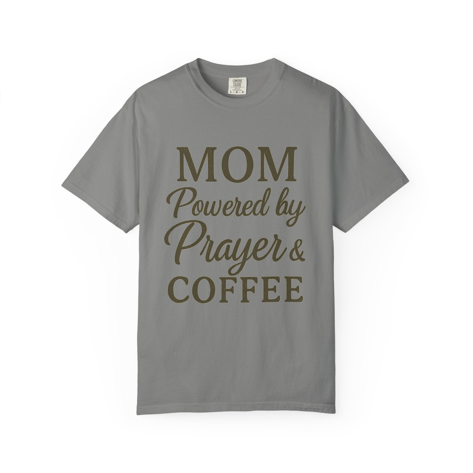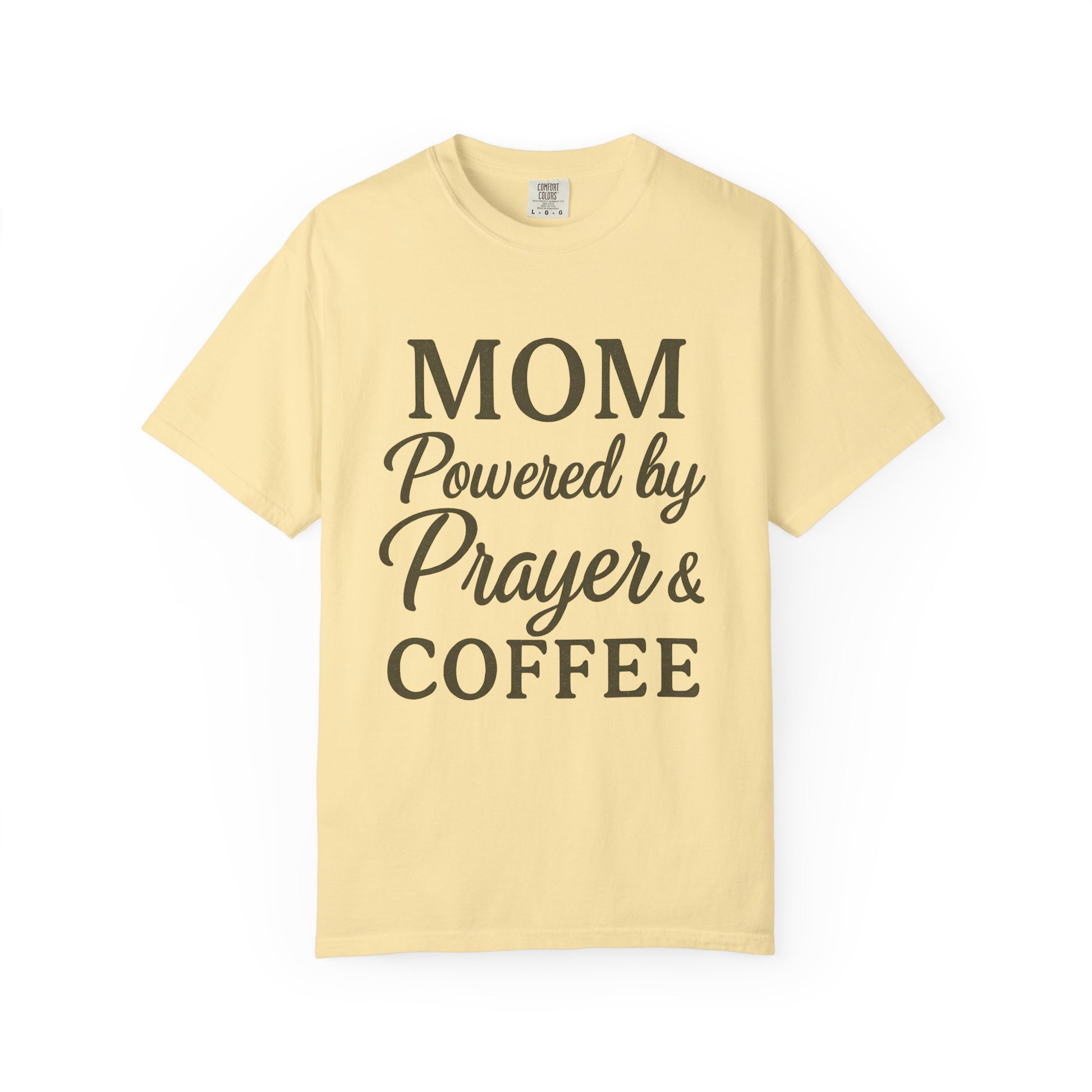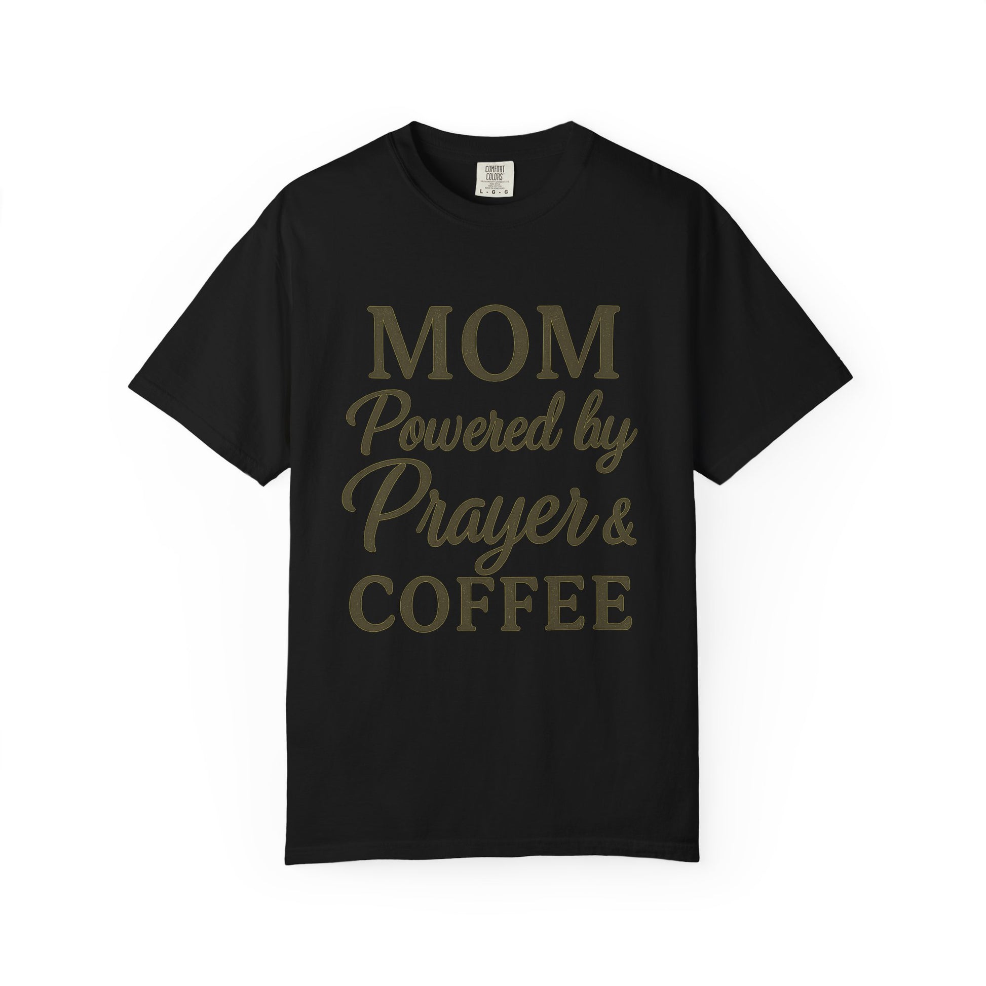 Mom Powered by Prayer & Coffee T-Shirt – Christian Faith Tee for Moms | Bold & Cozy Everyday Wear