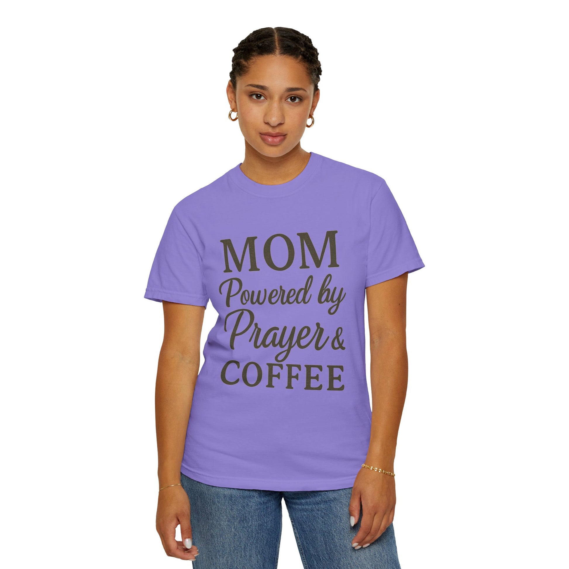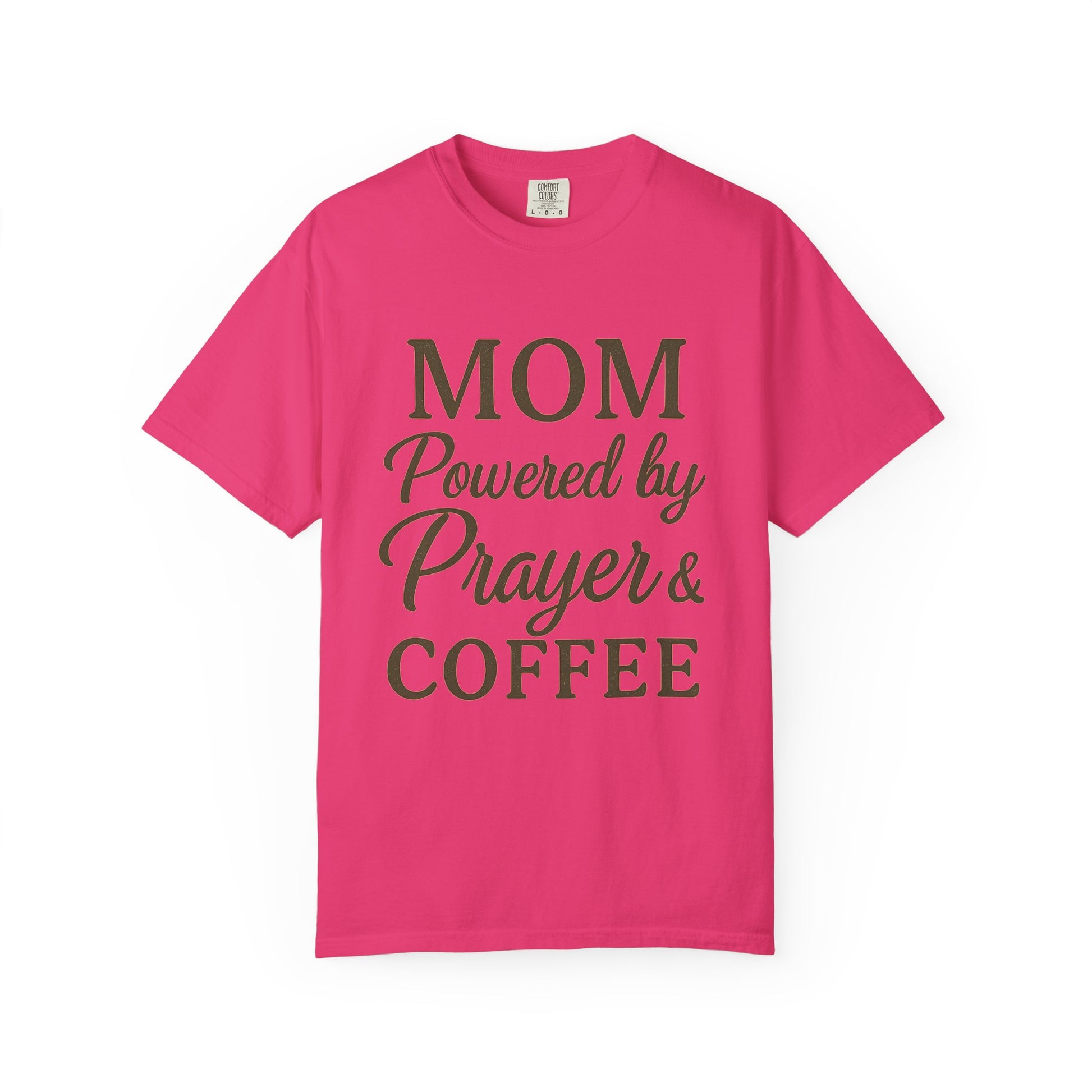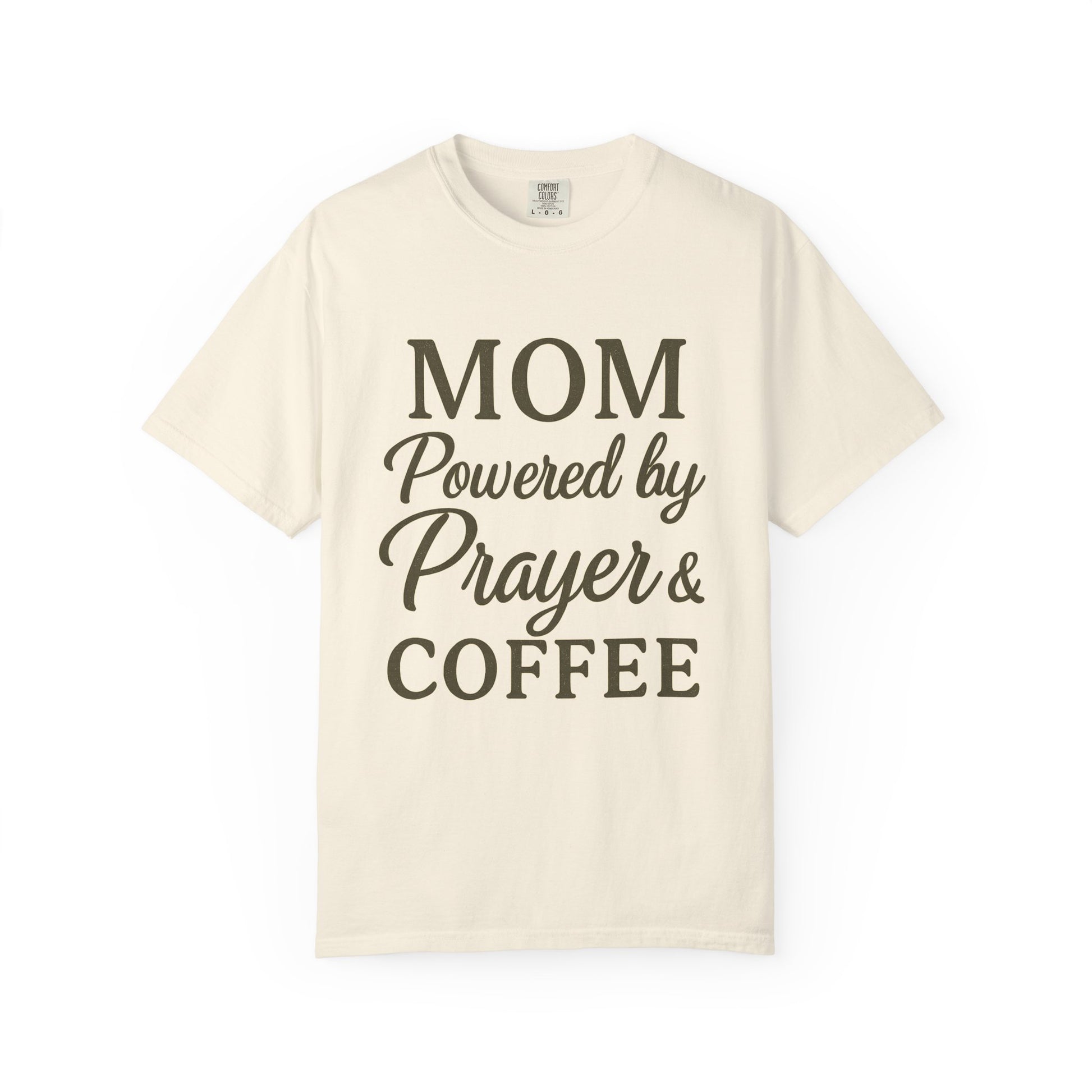 Mom Powered by Prayer & Coffee T-Shirt – Christian Faith Tee for Moms | Bold & Cozy Everyday Wear