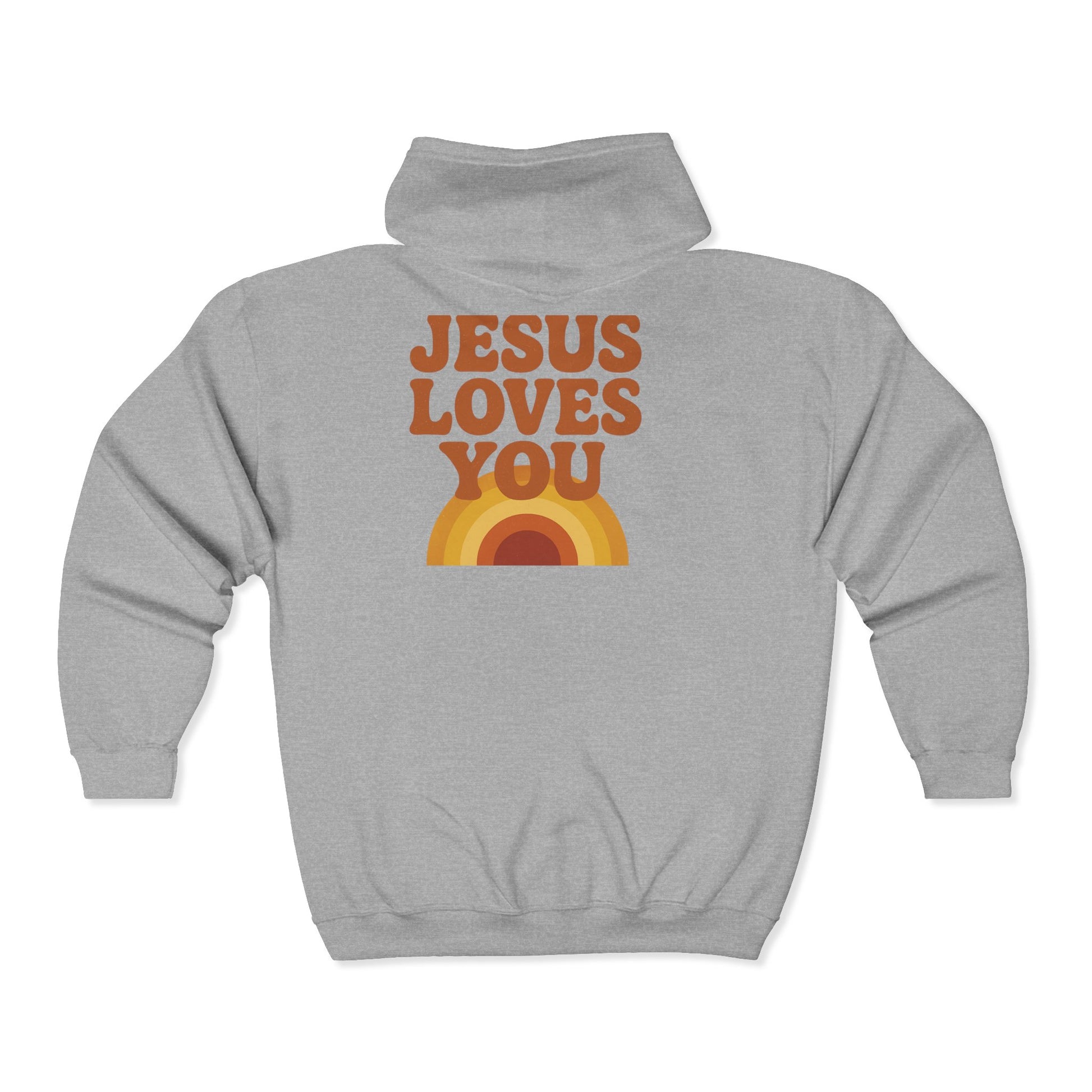 Retro “Jesus Loves You” Zip-Up Hoodie – Cozy Christian Sweatshirt for Everyday Comfort (Unisex)