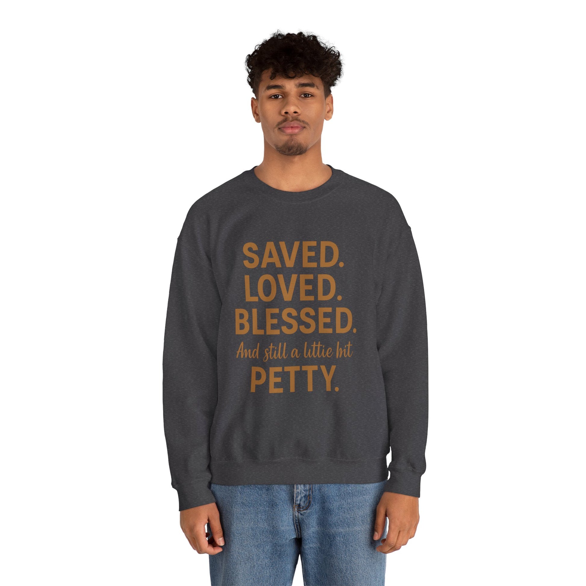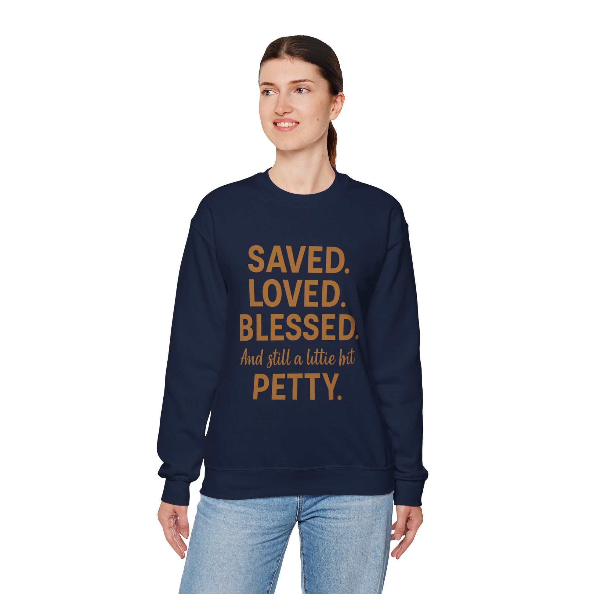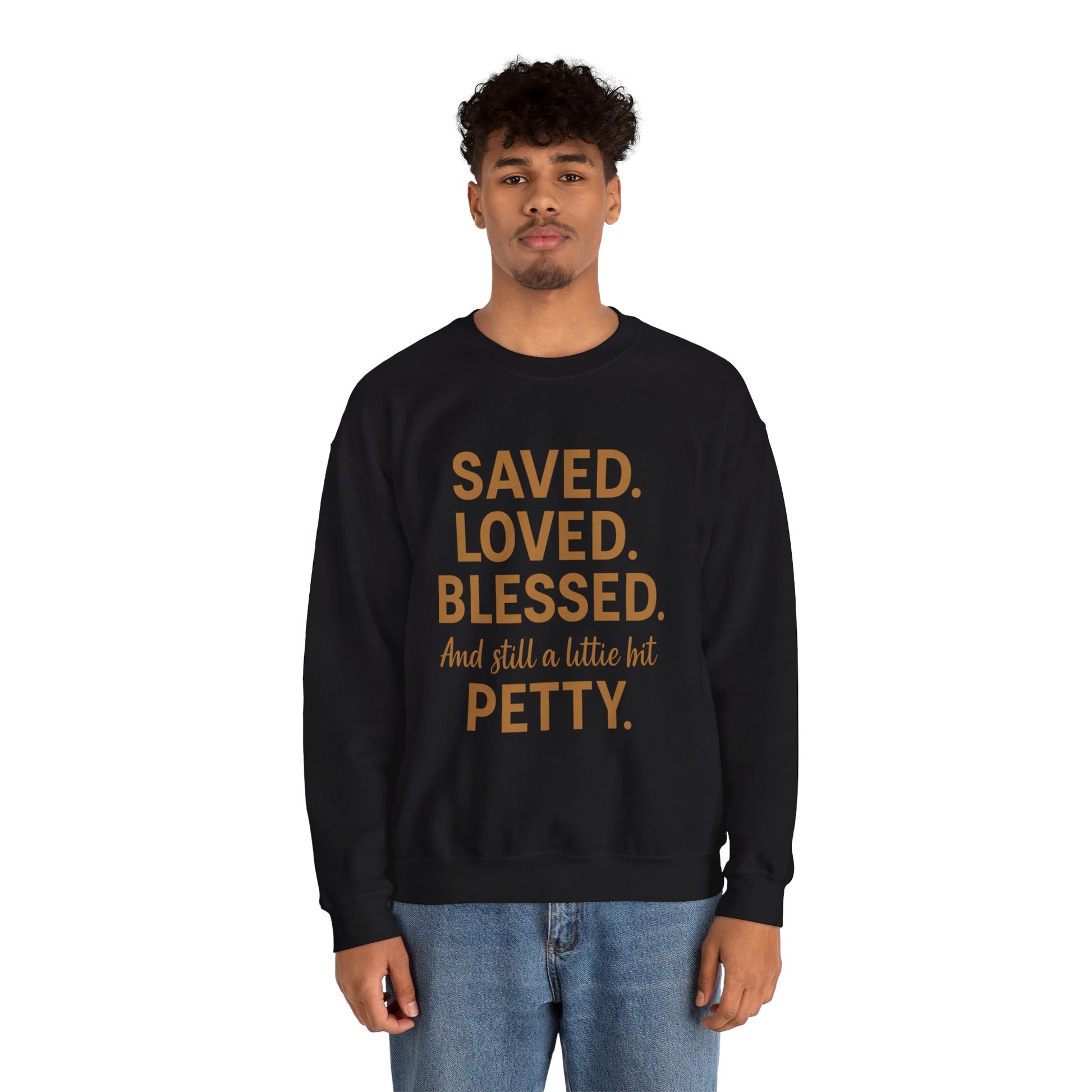 “Saved. Loved. Blessed. And Still a Little Bit Petty Unisex Christian Sweatshirt – Faith with Attitude”