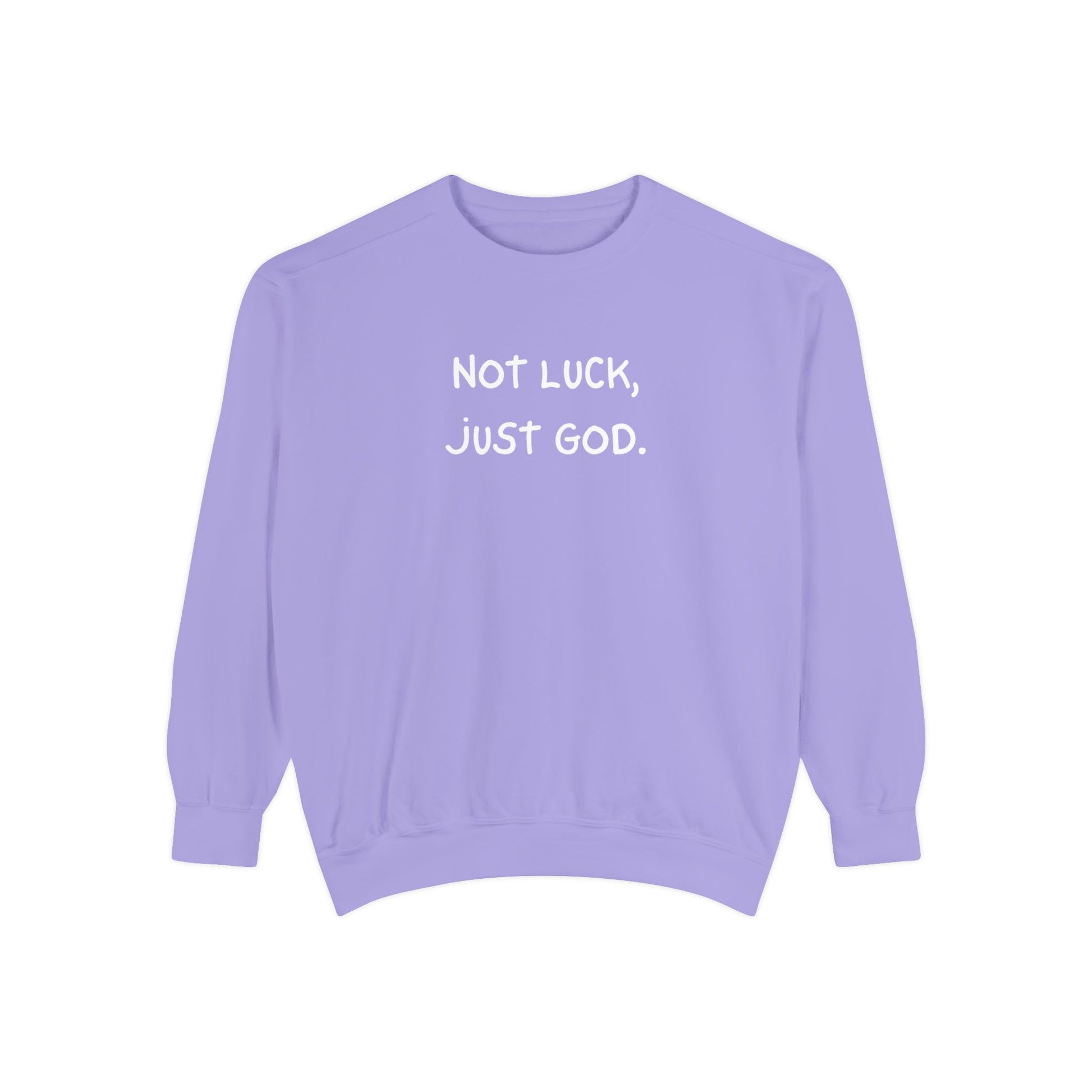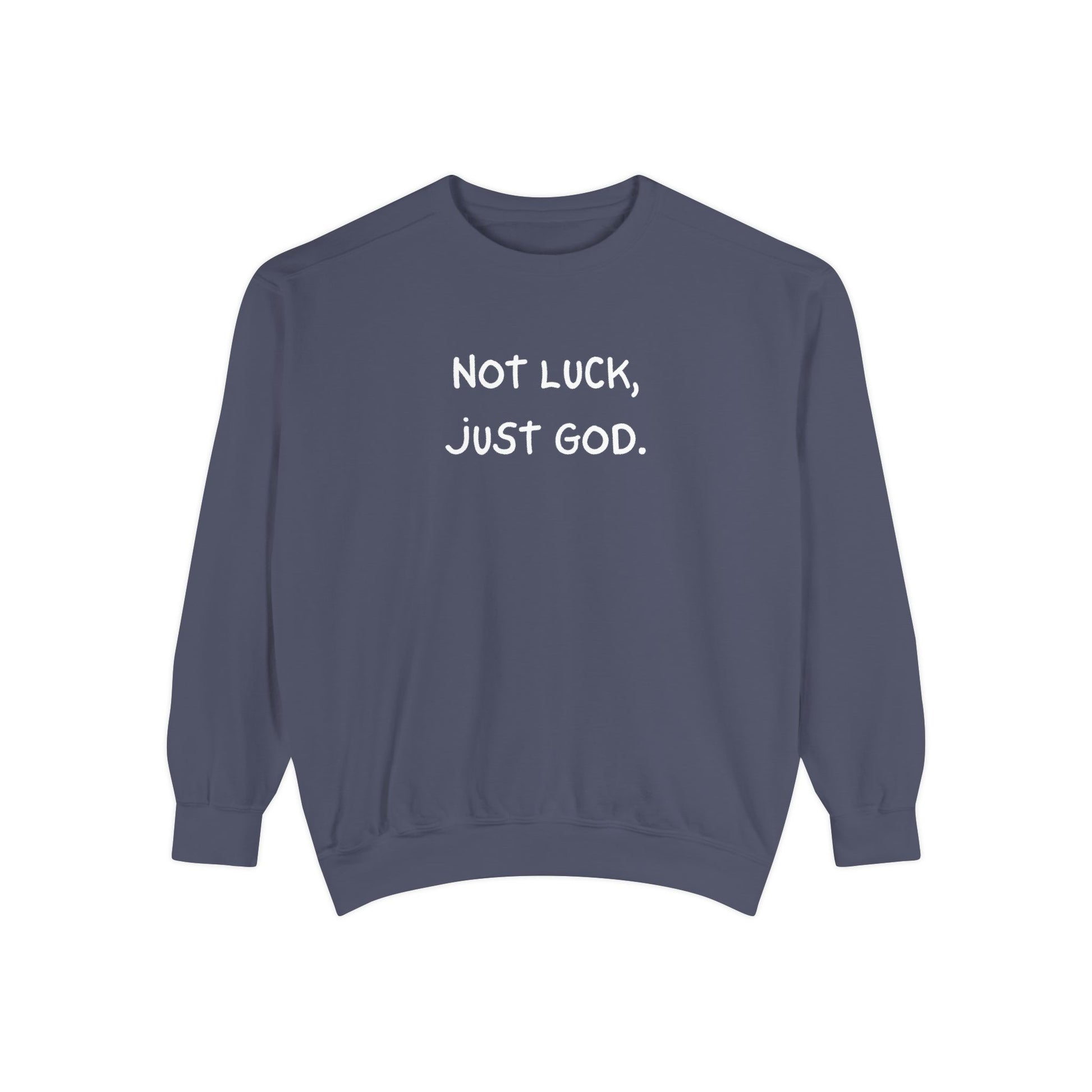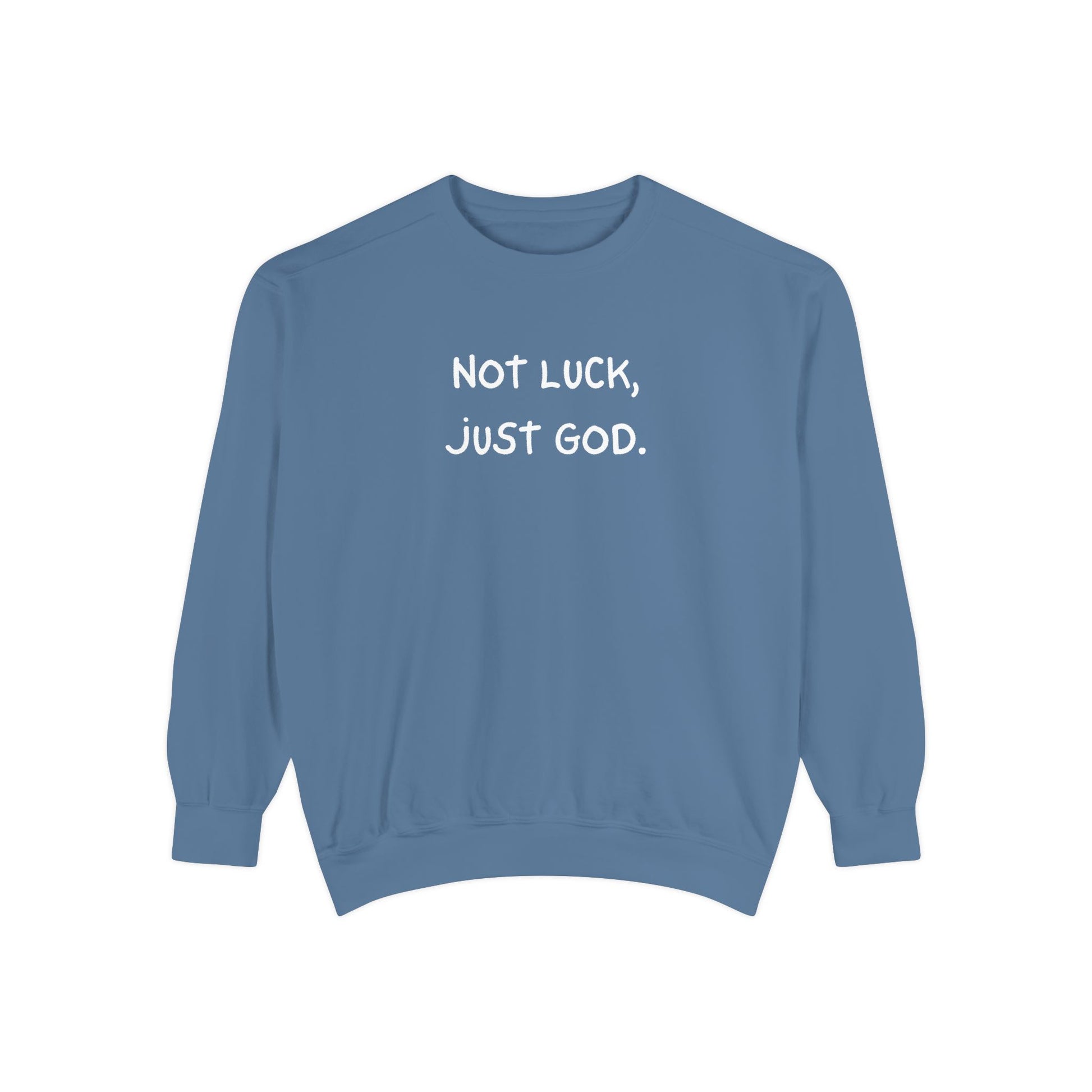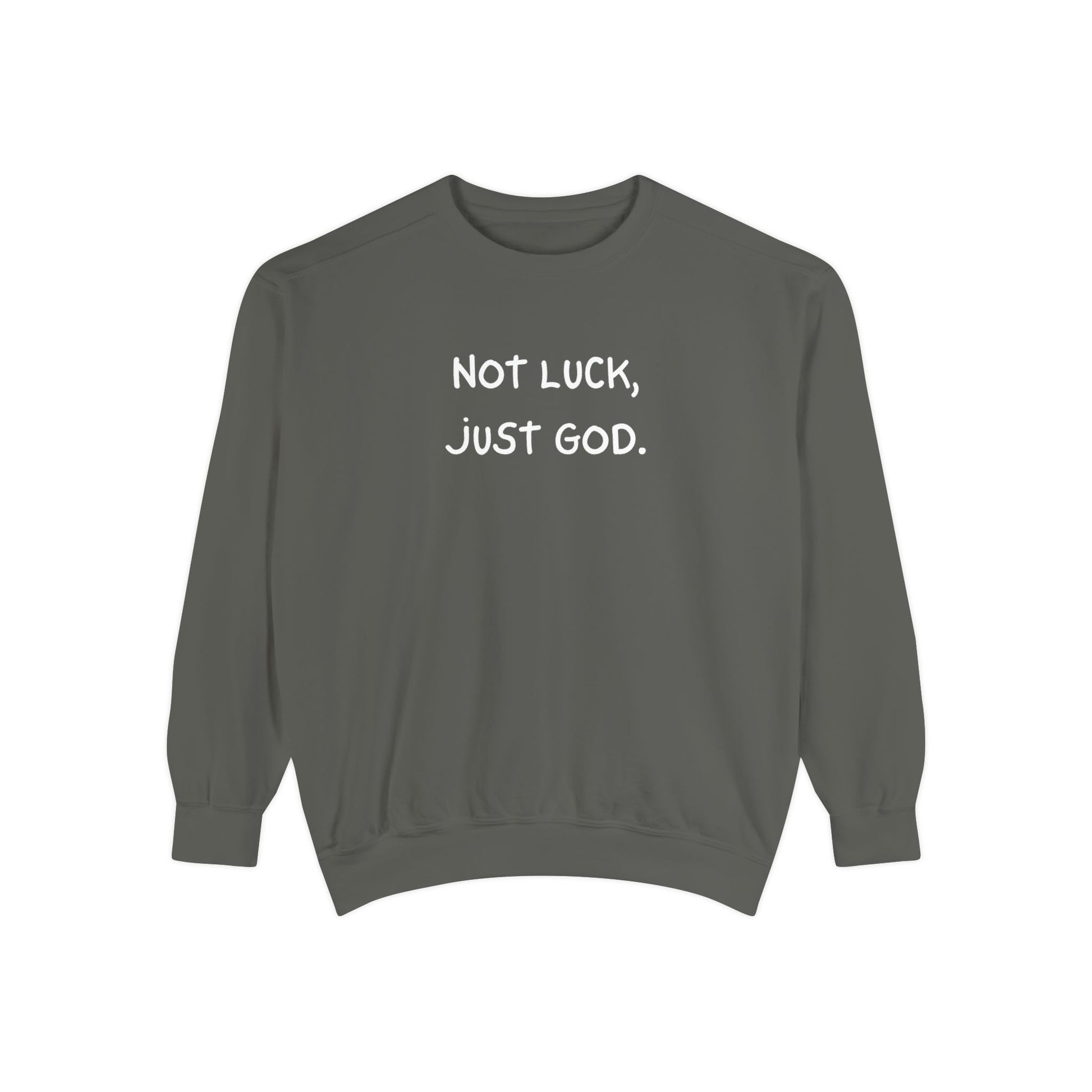 This Unisex Garment-Dyed Sweatshirt features the phrase 'Not luck, just God' embroidered on the chest. With a relaxed fit and ribbed collar, cuffs, and bottom hem, this sweatshirt is both comfortable and stylish. Perfect for those seeking a cozy and faith-inspired addition to their wardrobe, suitable for adults. Ideal for wearing on casual days, during religious gatherings, or as a thoughtful gift for loved ones.