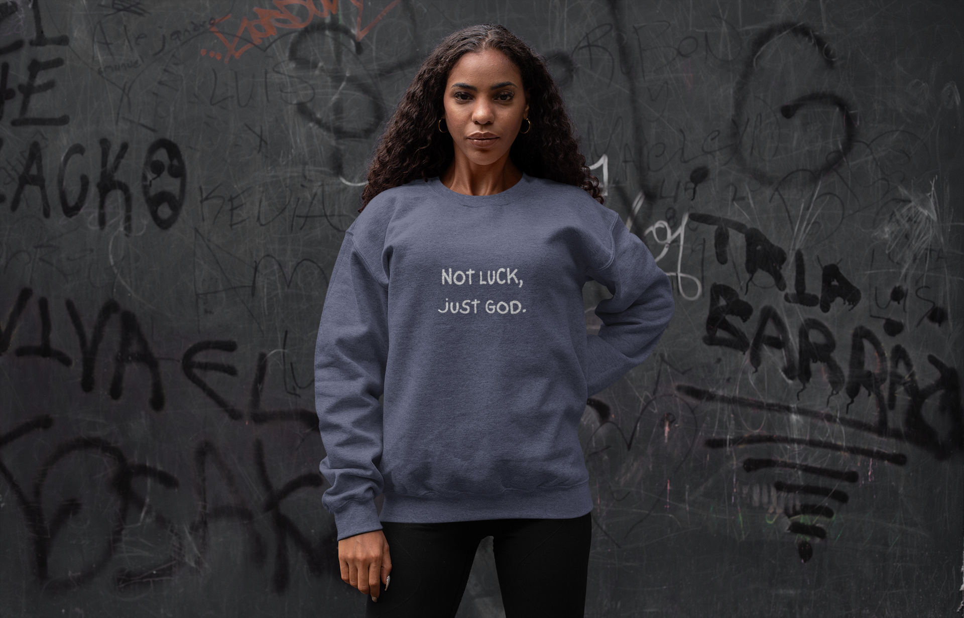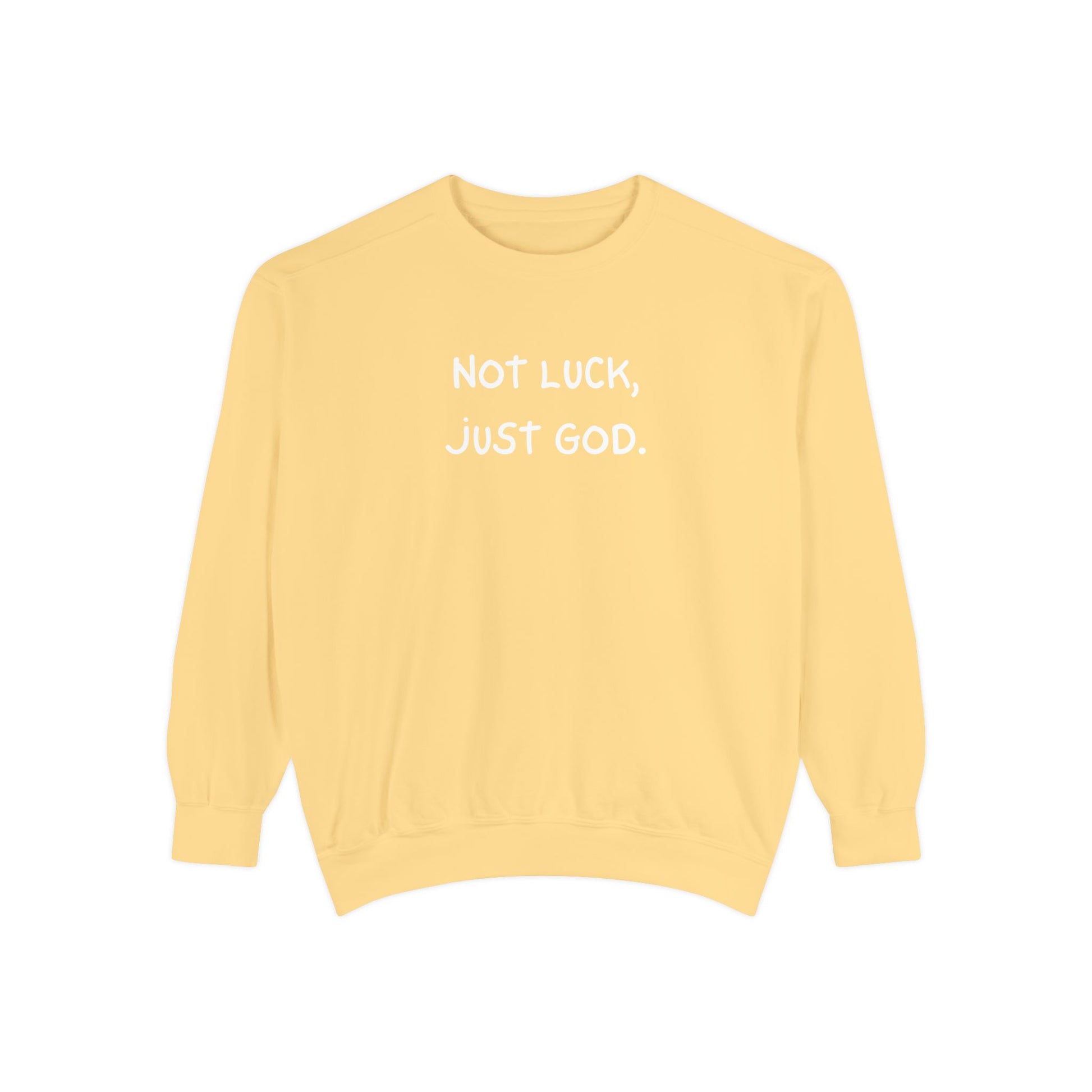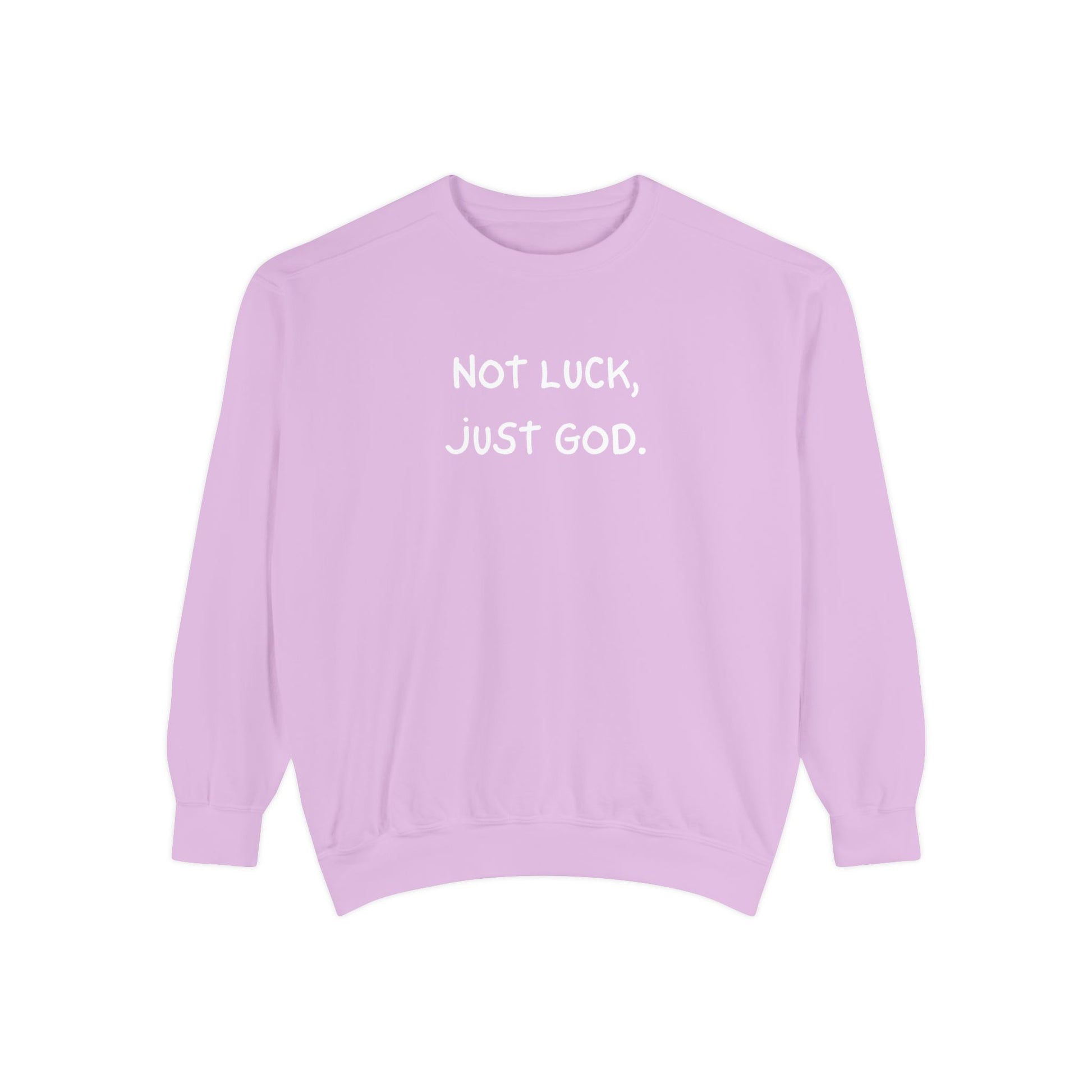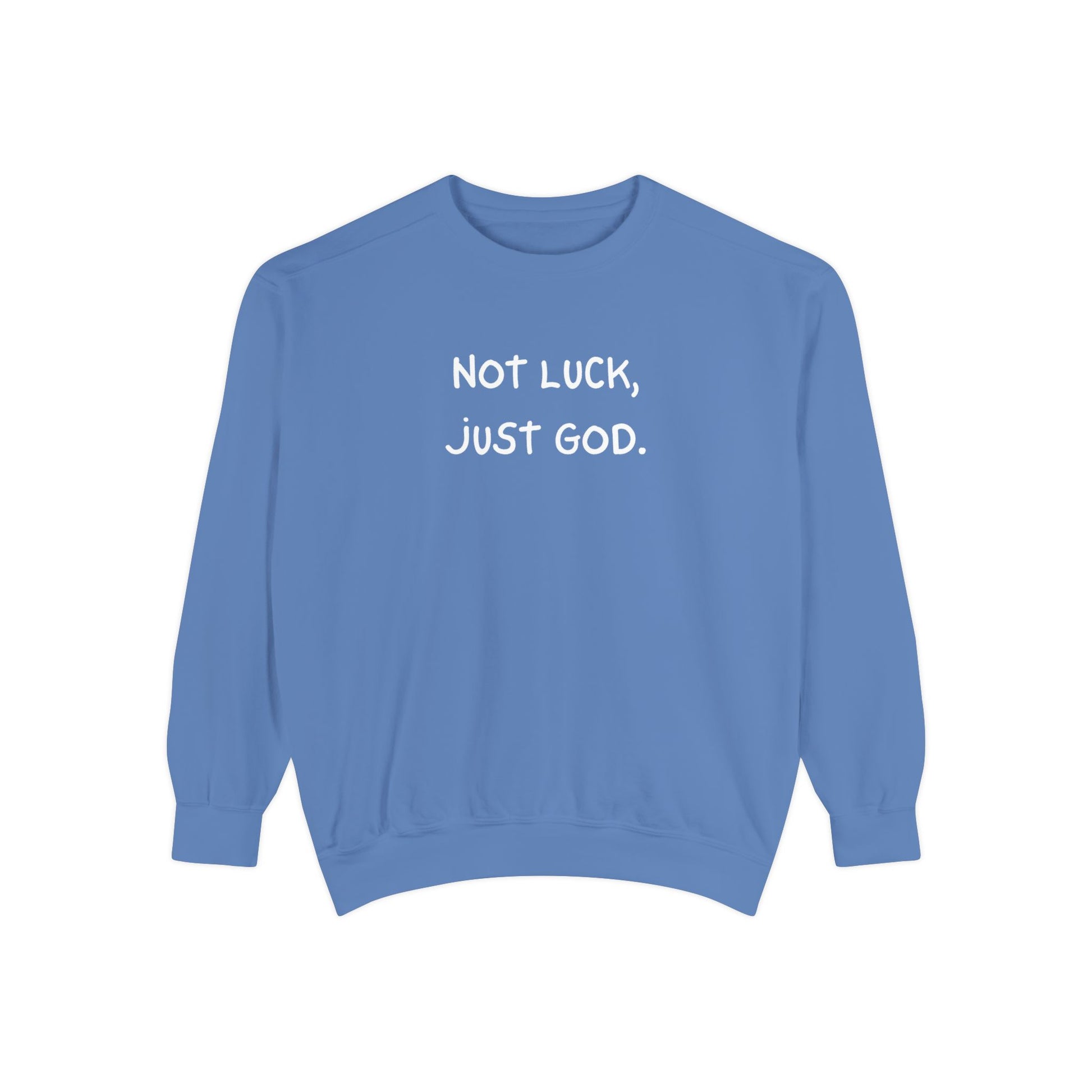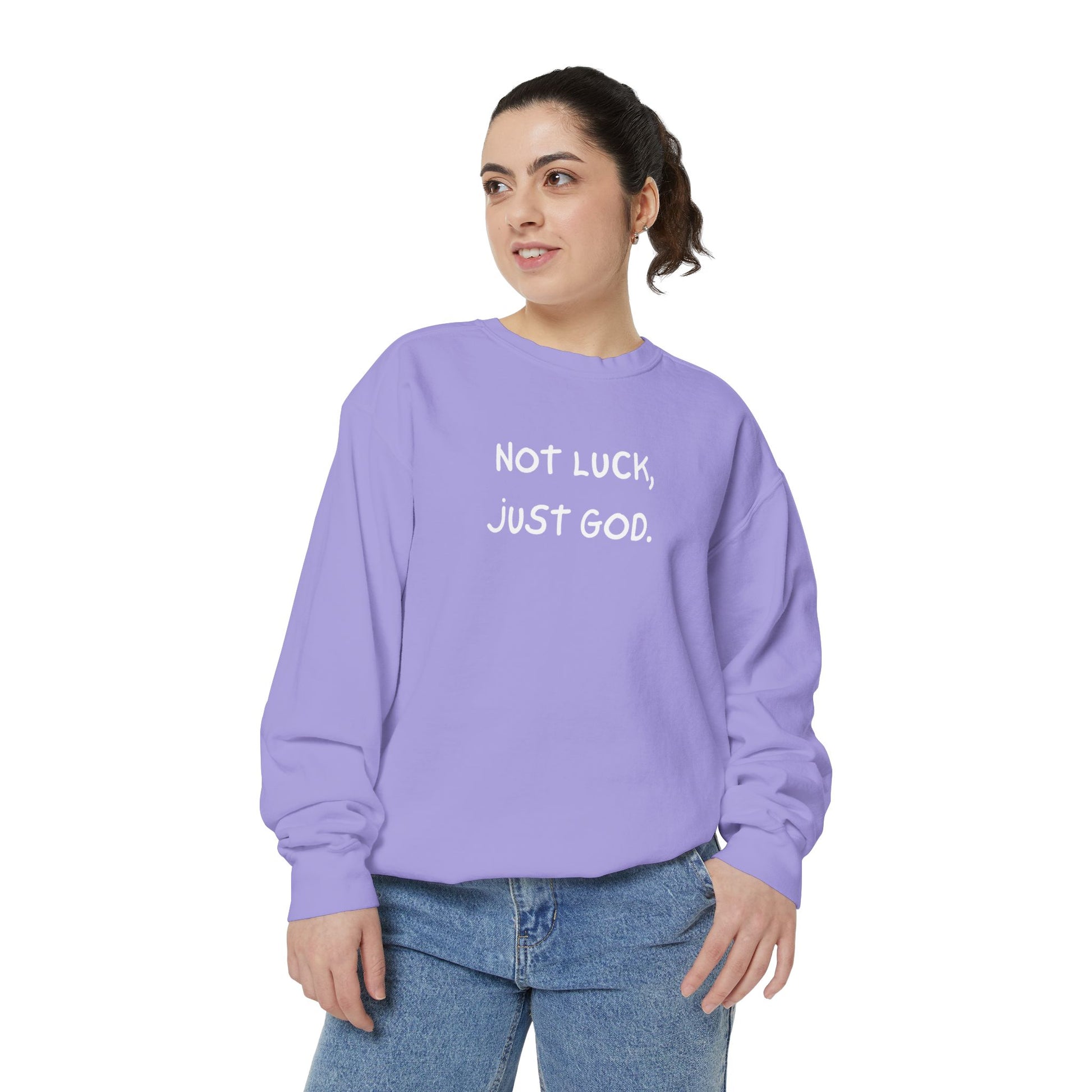 This Unisex Garment-Dyed Sweatshirt features the phrase 'Not luck, just God' embroidered on the chest. With a relaxed fit and ribbed collar, cuffs, and bottom hem, this sweatshirt is both comfortable and stylish. Perfect for those seeking a cozy and faith-inspired addition to their wardrobe, suitable for adults. Ideal for wearing on casual days, during religious gatherings, or as a thoughtful gift for loved ones.
